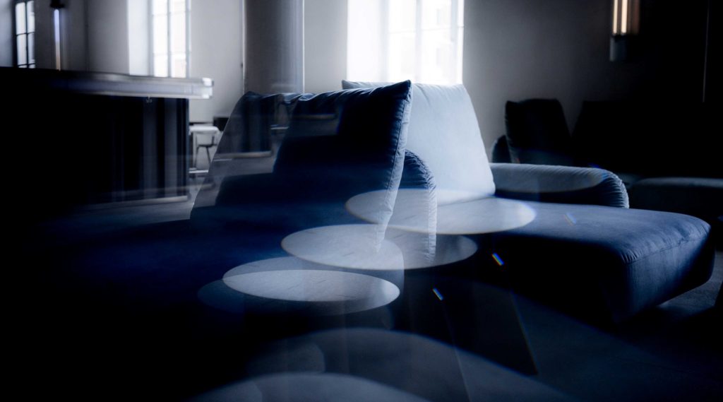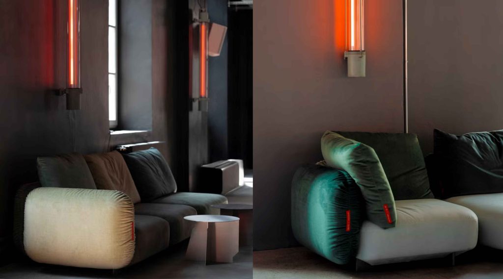 Musillo descrive uno spazio che vive di contrasti: illuminazione al neon, geometrie nette e superfici industriali che si abbinano a volumi soffici e forme morbide.